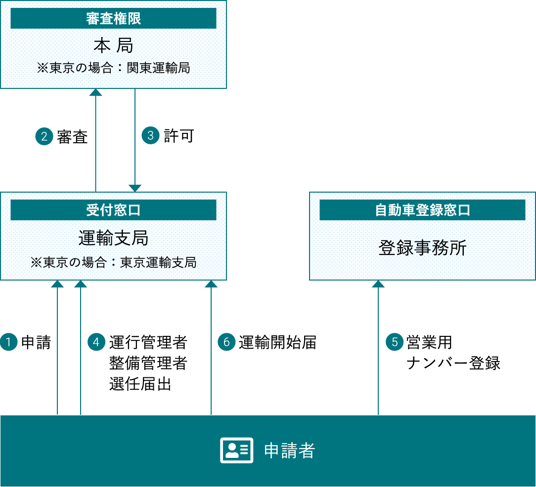 許可のための申請書類を提出する窓口は、”運輸支局”。書類の審査は、”本局”へ。(東京の場合は、関東運輸支局)さらに、自動車登録は、”自動車登録事務所”へ提出が必要です。