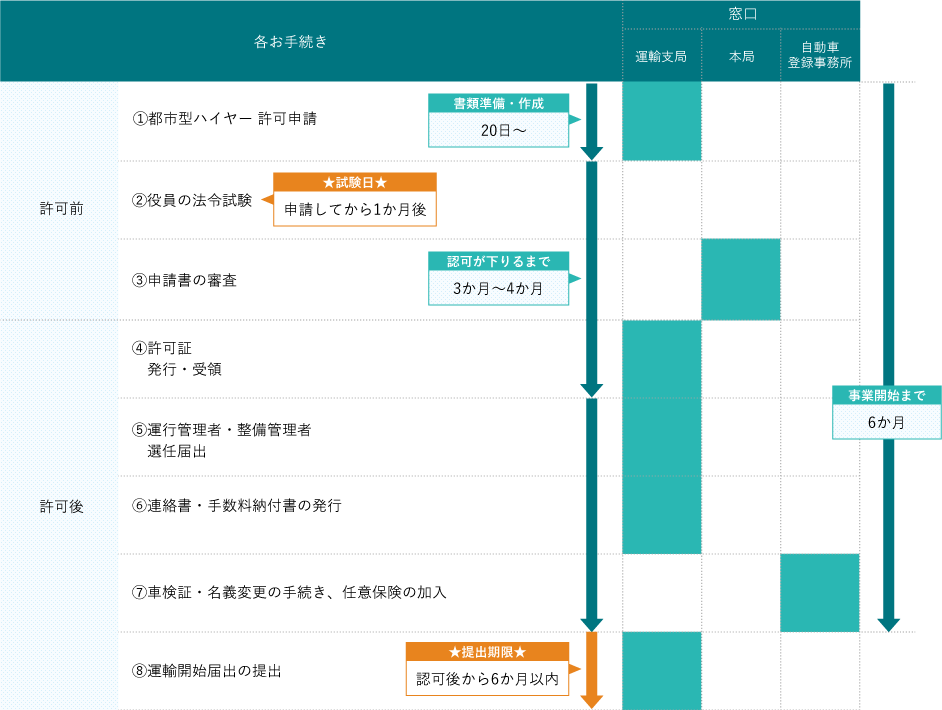 都市型ハイヤーを開始するまでに、多くの申請手続きがございます。
